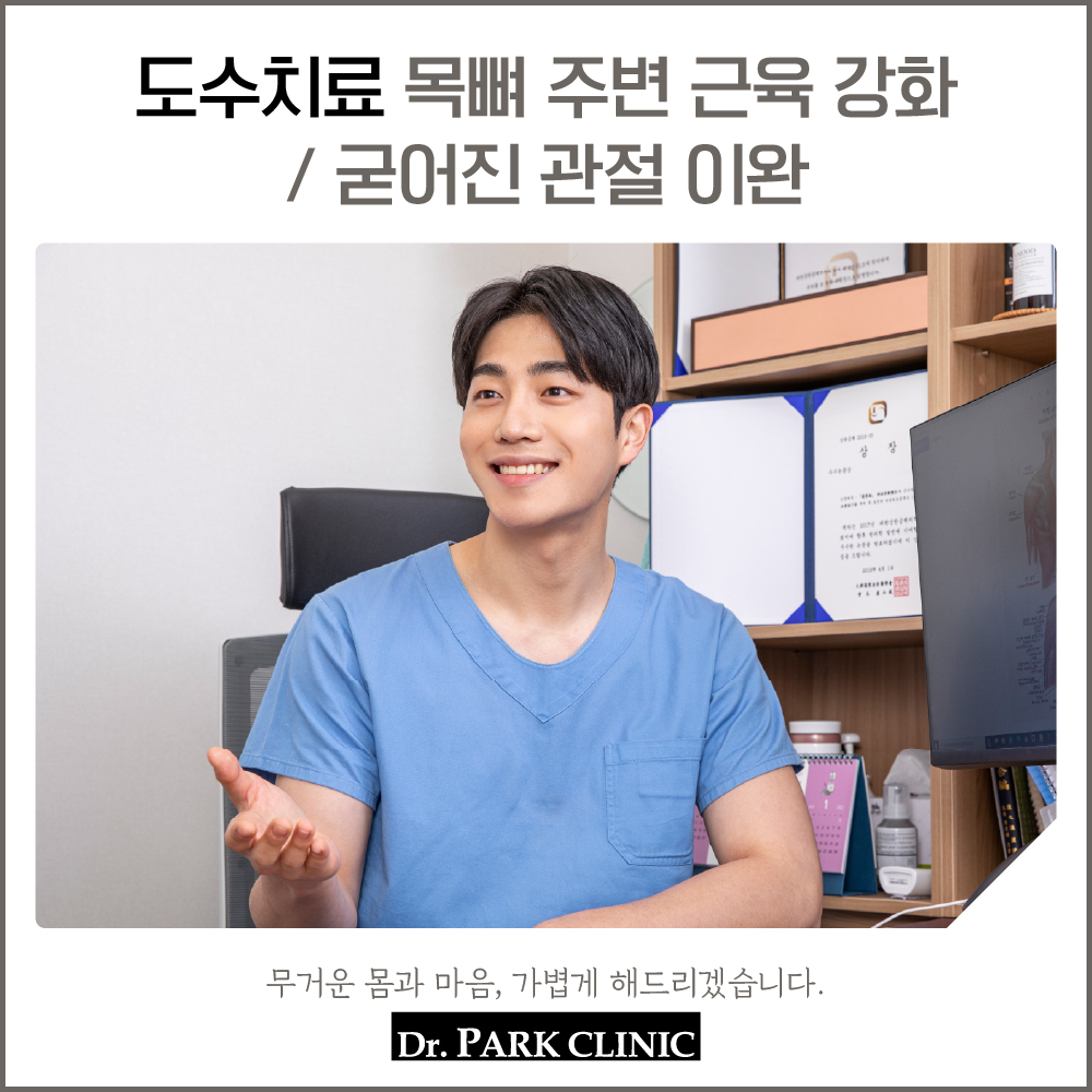 도수치료는 목뼈 주변의 근육을 튼튼하게 만들고, 굳어진 관절을 이완함으로 틀어져 있는 척추를 재정렬시킴으로 신경의 압박을 완화시키고, 장기적으로는 주사나 수술 없이 인체가 가진 본연의 힘으로 정상적인 생활을 유지할 수 있게 해줍니다.