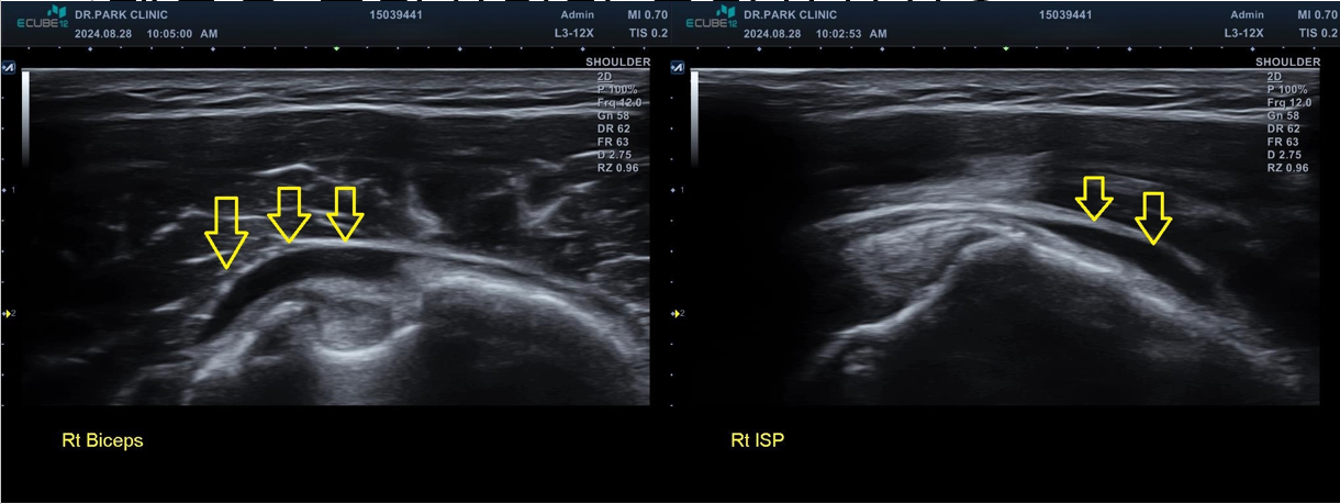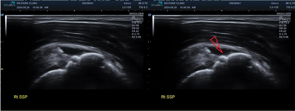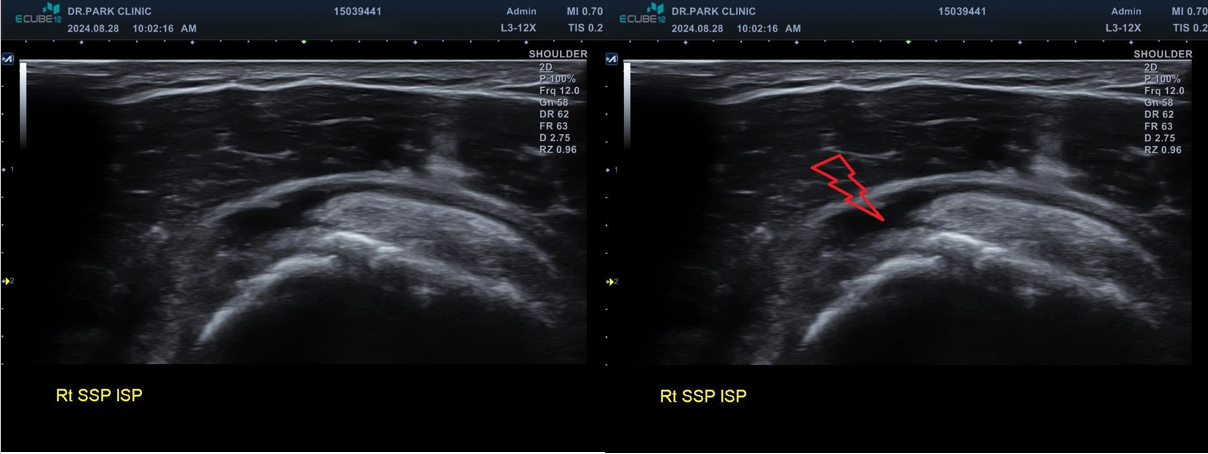 나 : 초음파상에서 어깨 극상근이라는 힘줄 파열이 관찰되네요. 이게 제일 문제입니다