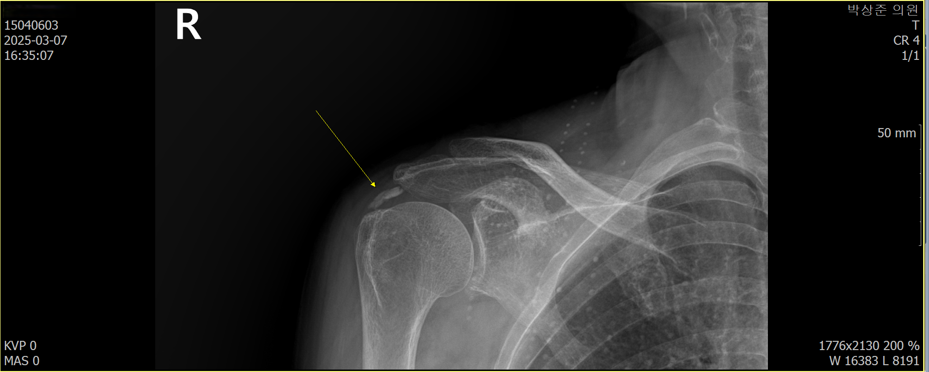 석회성 건염의 경우 사이즈가 조금만 커도 x-ray에서 쉽게 진단이 가능합니다. 이 환자분의 경우 우측 어깨에 사이즈가 꽤 커다란 석회가 관찰되고 있었습니다.