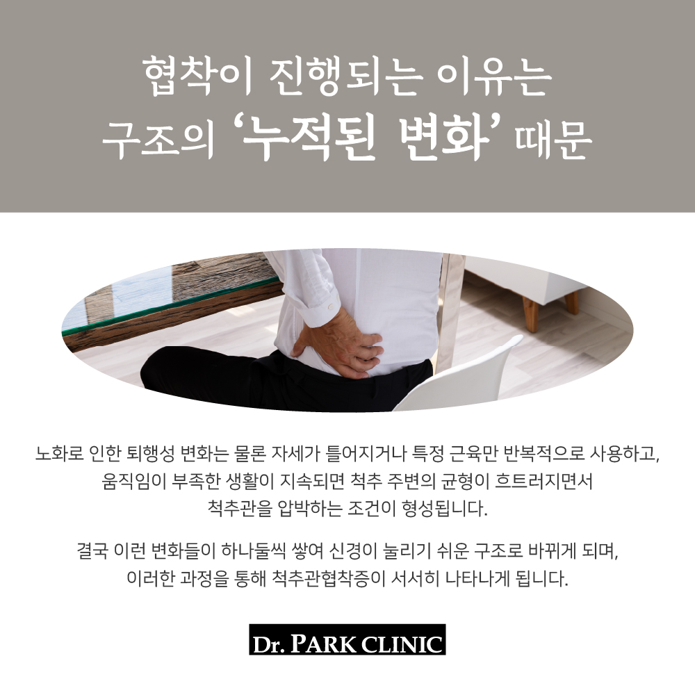 이러한 신경 압박이 왜 생기는지를 들여다보면, 단기간의 문제가 아니라 오랜 시간에 걸쳐 누적된 결과라는 것을 알 수 있습니다. 나이가 들면 디스크는 자연스럽게 얇아지고, 관절의 간격은 좁아지며, 척추를 둘러싼 인대는 조금씩 두꺼워지기 시작합니다.