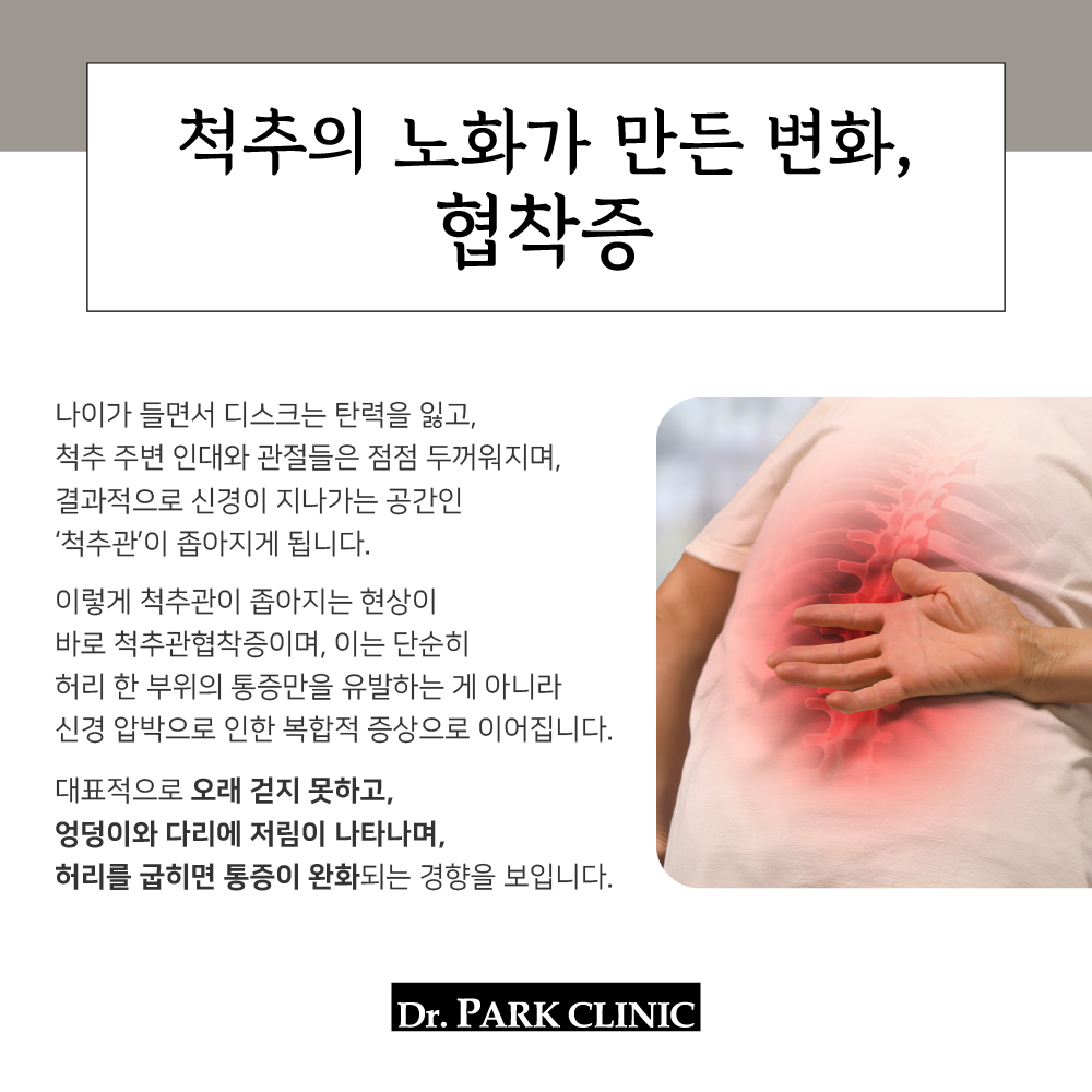 앞서 말한 것처럼 퇴행성 통증의 중심에는 종종 척추가 자리 잡고 있습니다. 나이가 들면서 디스크는 탄력을 잃고, 척추 주변 인대와 관절들은 점점 두꺼워지며, 결과적으로 신경이 지나가는 공간인 ‘척추관’이 좁아지게 됩니다.