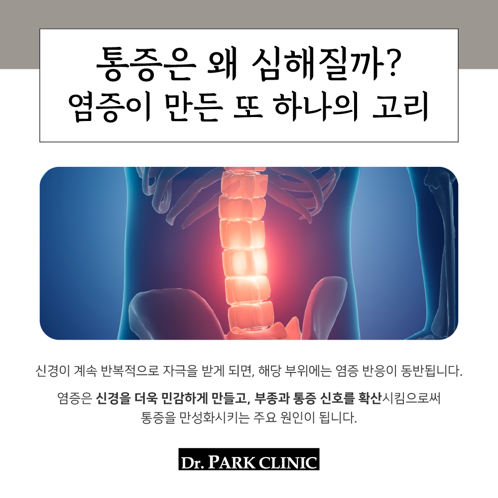 염증은 신경을 더욱 민감하게 만들고, 부종과 통증 신호를 확산시킴으로써 증상을 만성화시키는 주요 원인이 됩니다. 한 번 민감해진 신경은 사소한 자극에도 반응하게 되어, 증상은 점점 더 강도 높게 나타납니다.