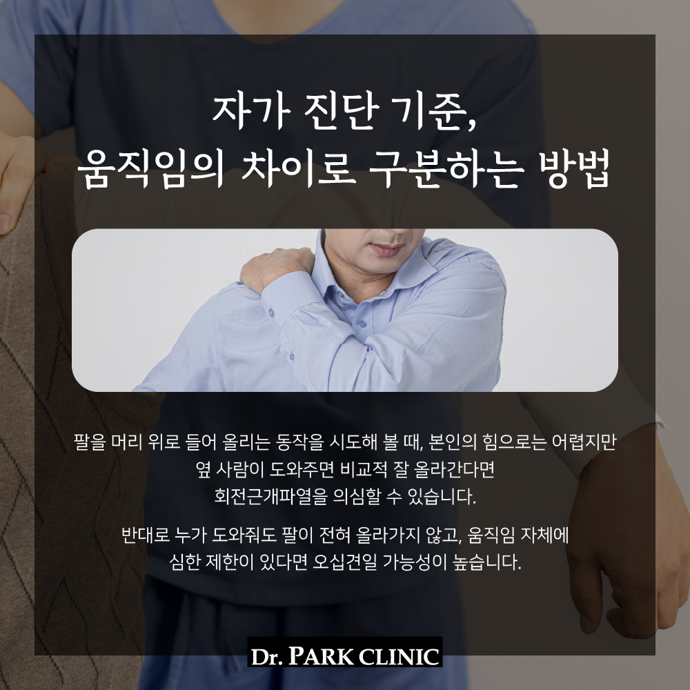 증상의 발현 시기나 원인만으로는 두 질환을 명확히 구분하기 어렵기 때문에, 일상에서 실천할 수 있는 간단한 자가 체크 동작이 중요합니다. 팔을 머리 위로 들어 올리는 동작을 시도해 볼 때, 본인의 힘으로는 어렵지만 옆 사람이 도와주면 비교적 잘 올라간다면 회전근개파열을 의심할 수 있습니다.