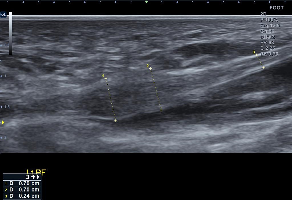 족저근막의 상태를 직접 확인하기 위해서는 초음파 검사가 꼭 필요한데요 초음파 검사를 통해 족저근막의 두께·염증 소견을 직접 확인합니다. 족저근막 두께 증가(보통 4mm 이상), 저에코(검게 보이는) 변화, 부착부(종골 내측 결절) 주변의 부종, 파열 여부, 필요 시 도플러로 활혈(염증성 혈류) 신호까지 확인할 수 있어, 현재 상태를 “눈으로” 보여주고 추적에도 유리합니다. 또한 종종 혼동되는 족저섬유종(결절성 변화) 등 감별에도 도움이 되는 검사가 초음파 검사입니다.