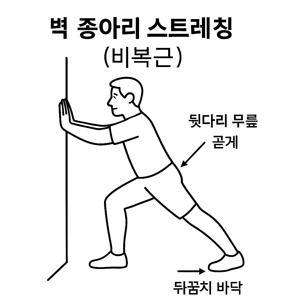 - 같은 자세에서 무릎을 살짝 굽히면 종아리 깊은 곳(가자미근)까지 자극됩니다.