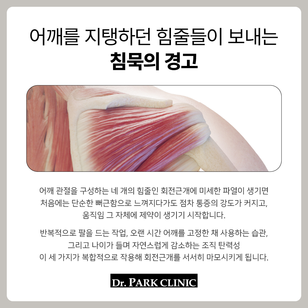 반복적으로 팔을 드는 작업, 오랜 시간 어깨를 고정한 채 사용하는 습관, 그리고 나이가 들며 자연스럽게 감소하는 조직 탄력성 이 세 가지가 복합적으로 작용해 회전근개를 서서히 마모시키게 됩니다. 결국, 우리 몸은 겉으로는 멀쩡해 보여도 안에서는 조금씩 무너져 내리고 있었던 것입니다.