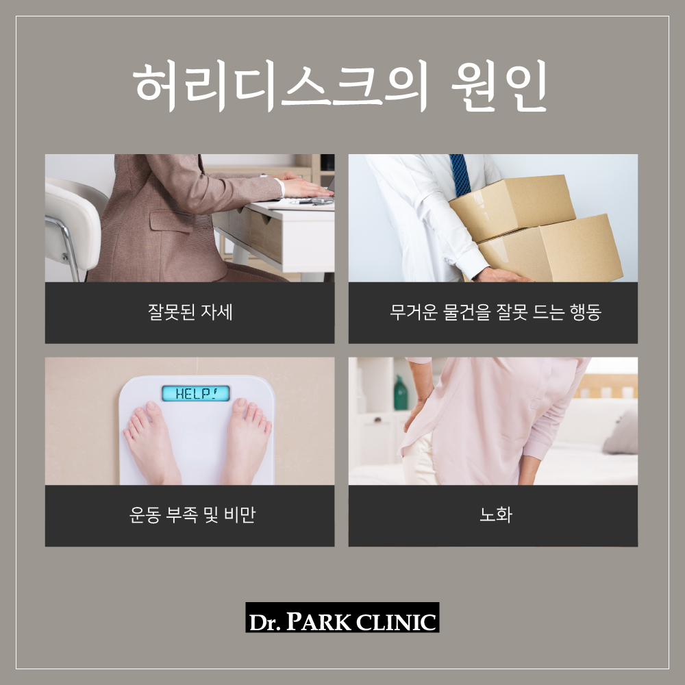● 허리디스크는 디스크 내부의 수핵이 탈출해 한쪽 신경을 압박하는 것이 주된 원인입니다.