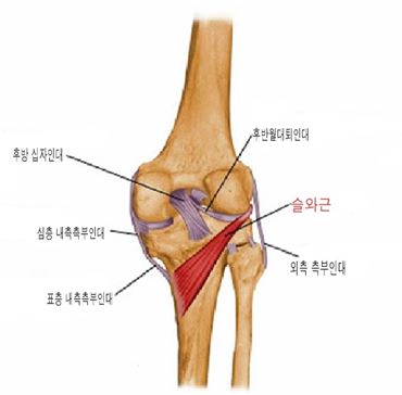 보통 이런 경우 무릎 뒤쪽에 슬와근을 의심해 볼 수 있습니다. 슬와근은 보시는 바와 같이 무릎 뒤에 위치한 손바닥만한 근육입니다. 이 근육은 무릎을 구부리거나 안쪽으로 돌리는 근육입니다. 그래서 빨리 걷거나 뛰다가 갑자기 방향전환 할 때 잘 다치는 근육이기도 합니다.