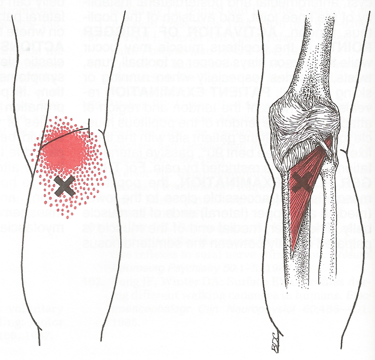 위 그림에서 보듯이, 무릎 뒤 주름 바로 아래에서 내측으로 ‘X’표시한 지점을 눌러보면 압통이 느껴지는 곳이 있습니다. 압통이 없다면 슬와근의 원인이 아닐 수 있으니 이 방법을 사용하지 않으셔도 됩니다.