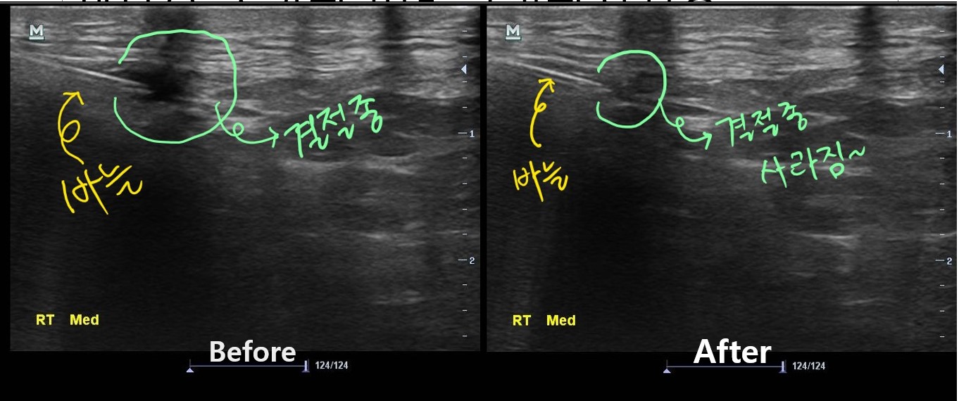 나 : 초음파 보면서 주사기로 물혹속 내용물을 제거해봐야 할거 같습니다.
