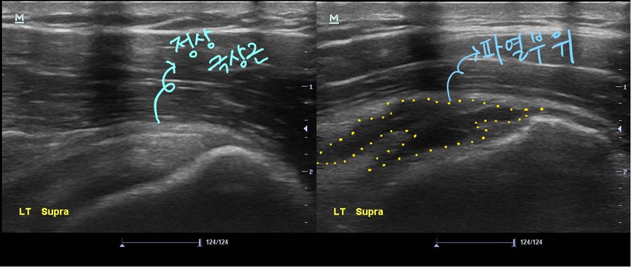 초음파 검사상에서 회전근개 중 하나인 극상근의 파열 정도가 생각보다 심해 보였습니다.