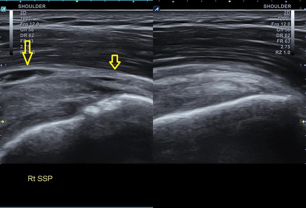 골극이 보이는 상완골 대결절 부위는 극상근 힘줄의 부착부위입니다. x-ray상에 이상 소견이 보인다는건 극상근 힘줄에도 문제가 있을 가능성이 높다는 이야기죠. 힘줄 상태를 확인하기 위해 초음파 검사를 진행했습니다. 결과는...
