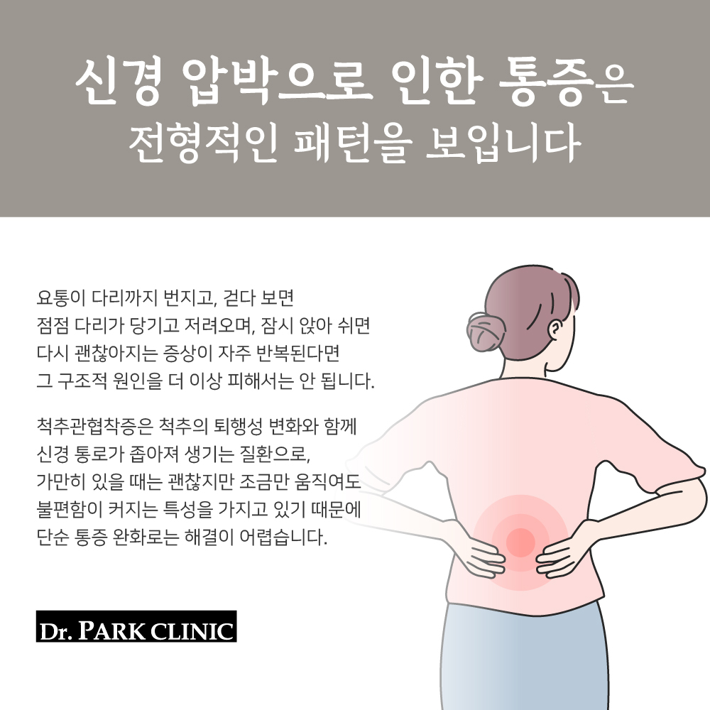 허리 통증이 골반이나 다리까지 번지고, 걷다 보면 점점 다리가 당기고 저려오며, 잠시 앉아 쉬면 다시 괜찮아지는 증상이 자주 반복된다면 그 구조적 원인을 더 이상 피해서는 안 됩니다. 이는 척추 속에서 신경이 눌리고 있다는 전형적인 신호입니다.