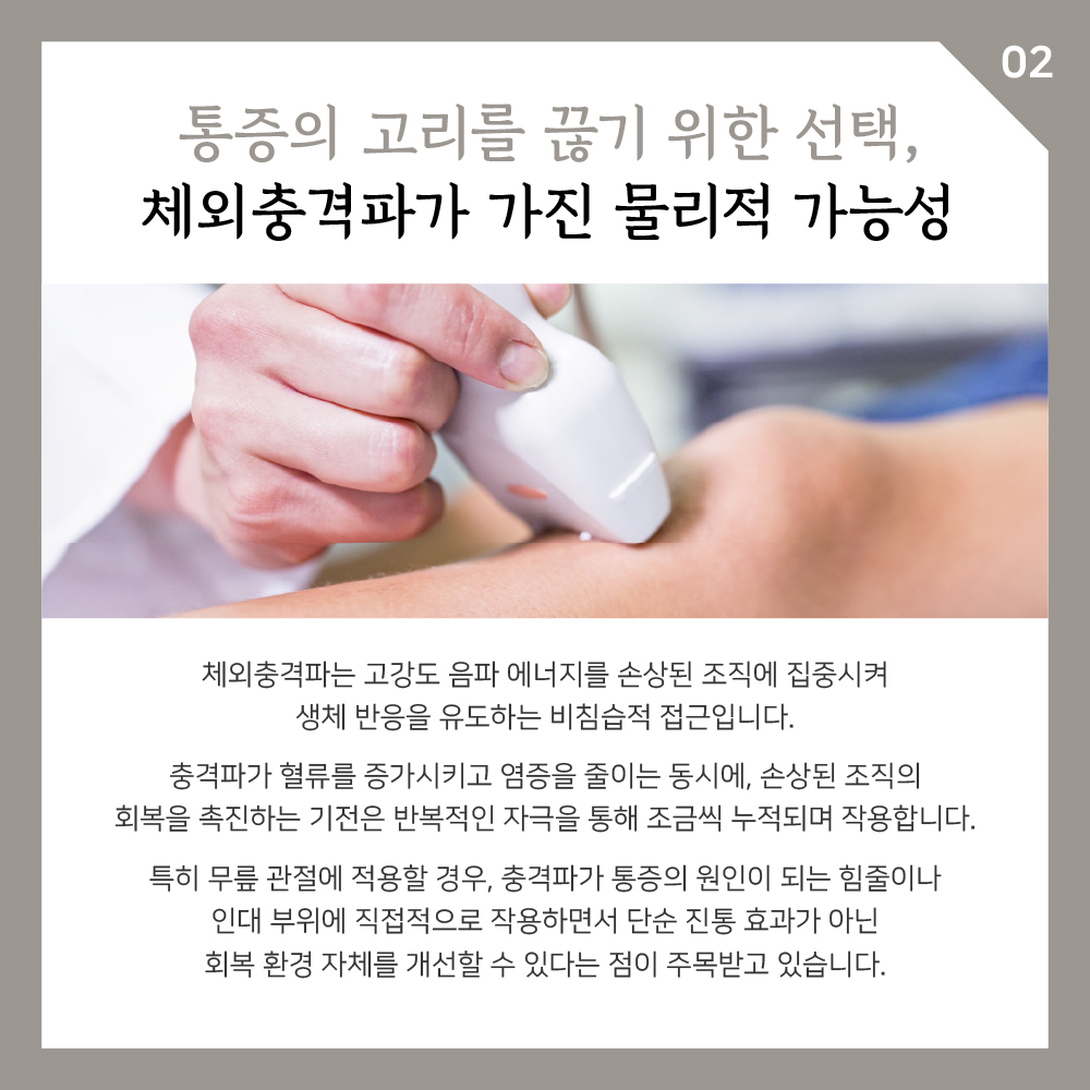 특히 무릎 관절에 적용할 경우, 충격파가 통증의 원인이 되는 힘줄이나 인대 부위에 직접적으로 작용하면서, 단순 진통 효과가 아닌 회복 환경 자체를 개선할 수 있다는 점이 주목받고 있습니다. 기존의 물리치료나 약물요법으로는 한계가 있었던 부분을 보완할 수 있다는 점에서 체외충격파는 퇴행성관절염의 비수술적 접근법으로서 실제 임상에서도 점점 더 활용 범위가 넓어지고 있습니다.