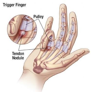 방아쇠 수지란 손을 많이 쓰는 경우 반복적으로 마찰이 생기면서 손을 구부리는 힘줄에 염증이 생기고 붓게 됨으로써 손가락을 구부리고 펴면서 힘줄이 무리없이 통과하던 터널같은 구조물(활차)을 부어있는 힘줄이 통과하지 못하게 됩니다.