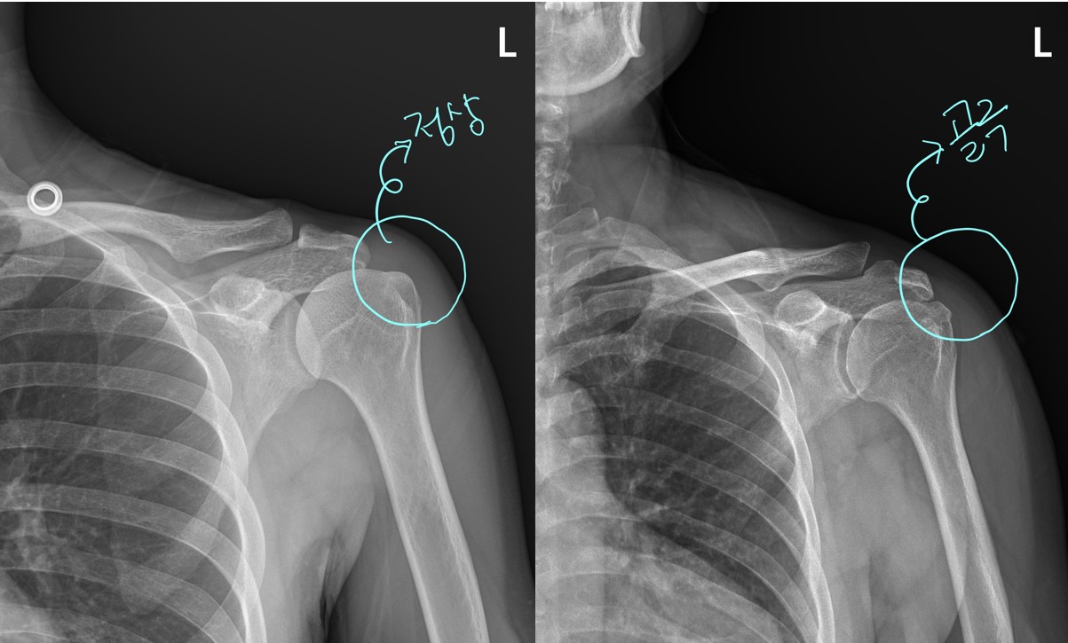 우선 x-ray를 좀 살펴보면..... 이것만 봐도 어깨 상태가 심상치 않음을 느낍니다. 일반적으로 정상적인 X-ray는 위팔뼈의 라인이 둥글둥글하게 부드럽게 넘어가야 하는데 이 환자분의 위팔뼈 부분은 울퉁불퉁하고 뾰족뾰족한 부분이 보입니다.